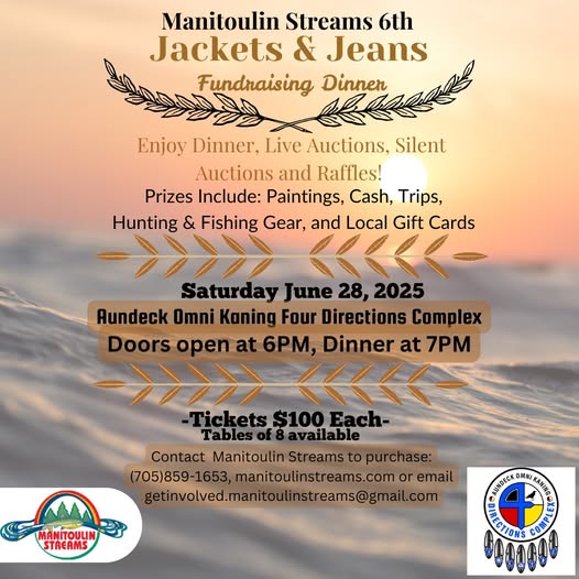 Join us for the 6th Annual Jackets & Jeans Fundraiser Dinner & Auction in Support of Manitoulin Streams — happening June 28th at the 4 Directions Complex in Aundeck Omni Kaning! 🕕 Doors open at 6:00 PM Tickets are $100 each - tables of 8 available. Contact 705-859-1653 or manitoulinstreams.com for tickets for an evening …