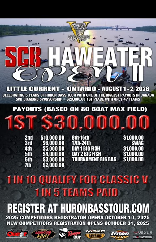 Huron Bass Tour 2026 - SCB Haweater Open II The Huron Bass Tour is proud to announce the SCB Haweater Open II. Registration for Classic IV anglers October 10, 2025, …